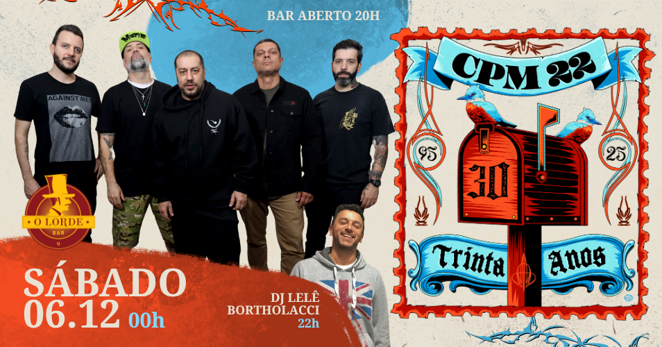 No dia 06 de dezembro, o O Lorde Bar recebe o CPM 22 em um show histórico da turnê que celebra 30 anos de estrada. Pra nós, do Lorde, é uma alegria imensa anunciar uma banda da qual somos fãs. Vai ser uma noite para cantar alto todos os clássicos do CPM 22 que a gente cresceu ouvindo e sentir de perto a energia de uma das maiores bandas do rock nacional. No setlist, não podem faltar “Um Minuto Para o Fim do Mundo”, “Dias Atrás”, “Irreversível”, “Regina Let’s Go”, “Não Sei Viver Sem Você” e “Tarde de Outubro” entre muitos outros. E, abrindo a noite, um set mais que especial do nosso amigo Lelê Botholacci.